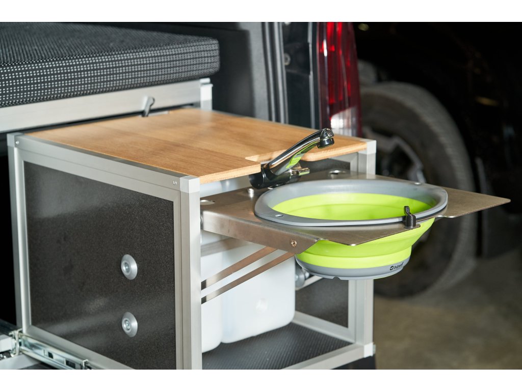 - Box s vodou je vybavený 2 kanistrami s objemom 2x 15 litrov a 12V čerpadlom. Hlavná časť výklopného drezu je z nerezových dielov, ktorý osadzujeme skladacím drezom od firmy Outwell. Box je z hornej časti zakrytý drevenou bio doskou vhodnou na prípravu jedla.