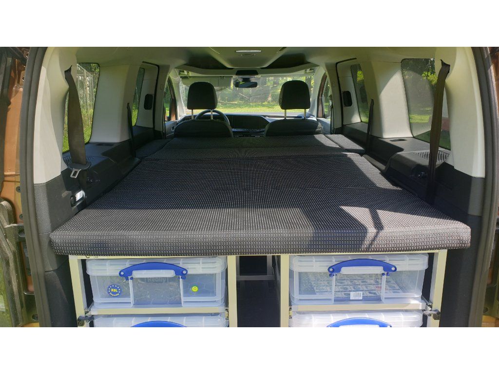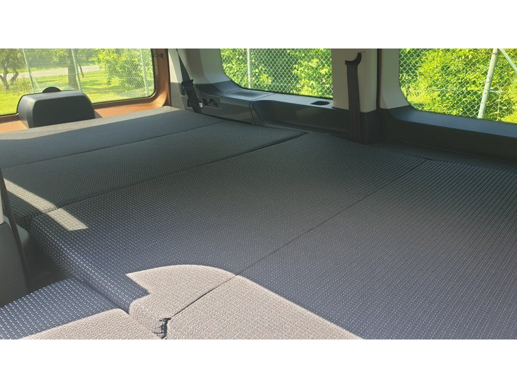 - Posteľ s dĺžkou 200cm s molitanovým matracom (výška matraca 7cm). Matrac je šitý na mieru a je cez celú šírku auta.Posteľ je nezávislá na sedadlách (video).Po rozložení postele Vám vznikne pod posteľou úložný priestor s výškou cca 41cm.
