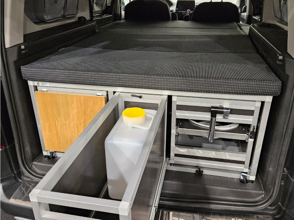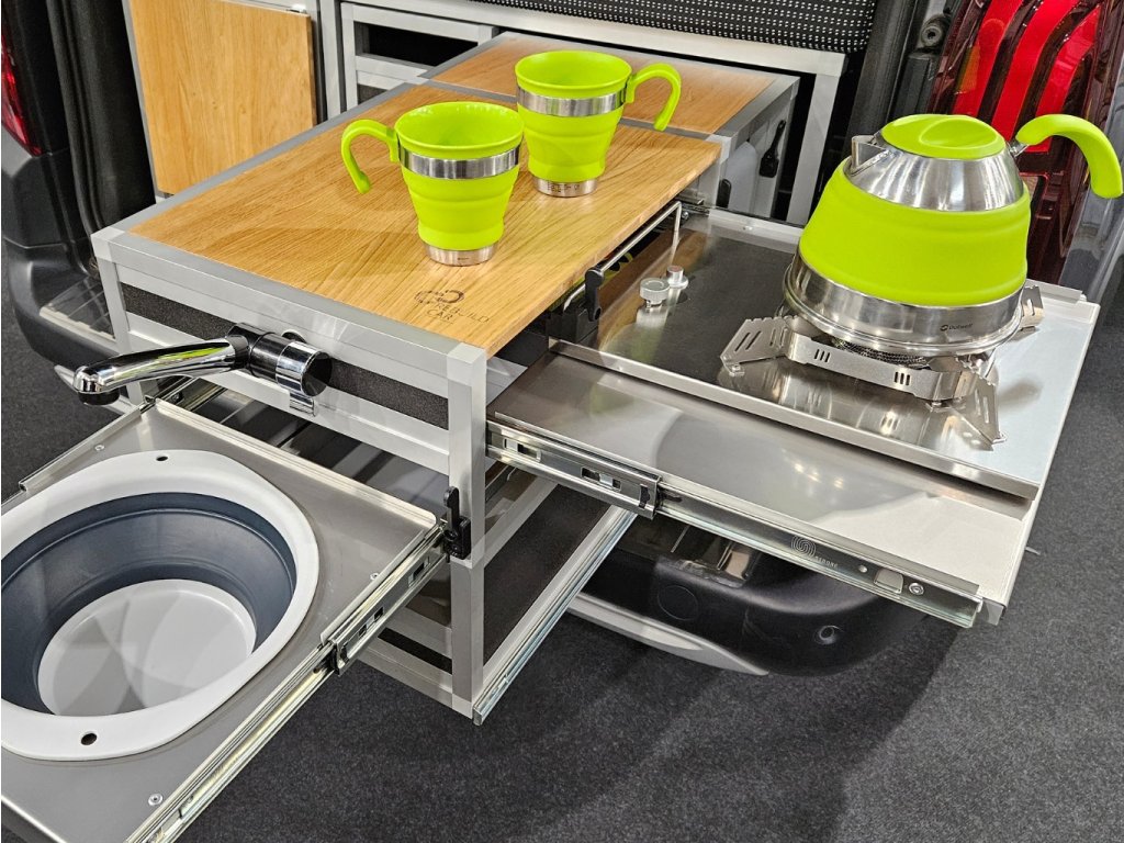 - Vařič na tekutú kartušu usadený vo výsuvnom nerezovom diele, ktorý pôjde do strany aj napriek priamosti auta. Vařič vychádza zo škatuľky jednoduššie vyndat a použiť samostatne napriek vestavbu. Pod varičem to odkládací prostar pre 2 kusy 230g kartuší a ďalší úložný prostar na veci.