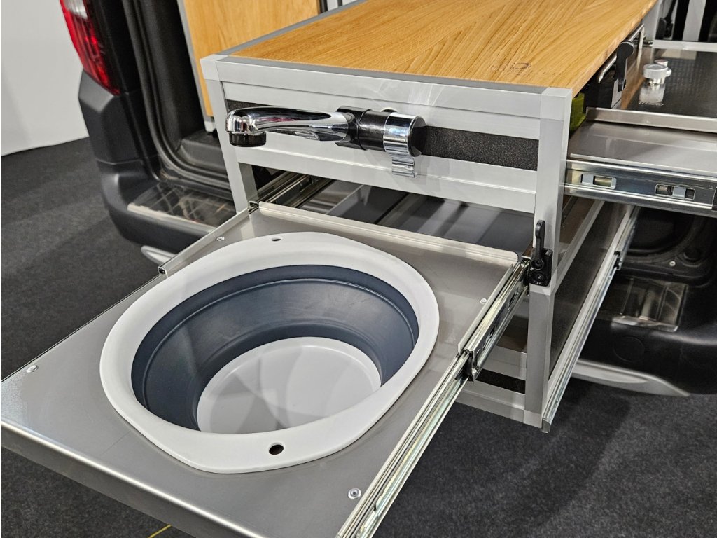 - Batérie na vodu s 12V batériu a 15 litrový kanistrom na pitnou vodu.Vysouvací nerezový dřezový diel, ktorý je osadený skládacím dřezem značky Outwell. Batéria môže byť použitá a samostatná aj bez drezu.
