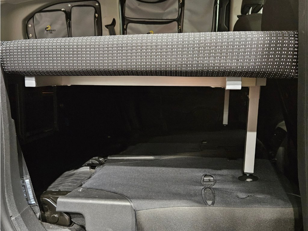 - Posteľ s dĺžkou 200cm s molitanovým matracom (výška matraca 7cm). Matrac je šitý na mieru a je cez celú šírku auta. Posteľ je nezávislá na sedadlách (video). Po rozložení postele Vám vznikne pod posteľou úložný priestor s výškou cca 30 až 39cm.