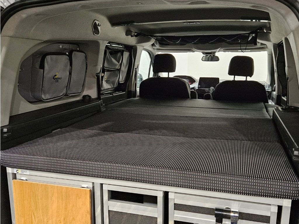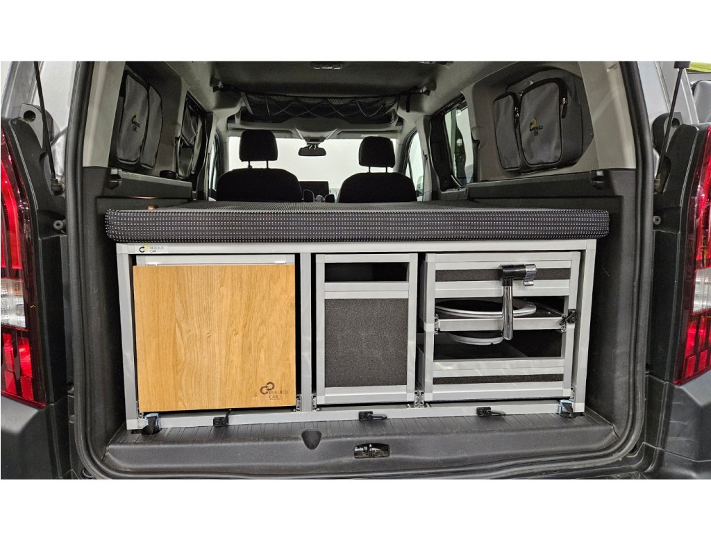 - Inštalácia vstavby nezaberie viac ako 5 minút. Vstavanie vložíte do auta (pre ľahšiu manipuláciu môžete vybrať všetky boxy), uchytíte pomocou skrutiek alebo popruhov a tašku s matracom a konštrukciou postele vložíte nad alebo za vstavbuje.Ilustračné video inštalácia a uchytenie vstavby do Peugeot Traveller (rovnaké pre Toyota ProAce Verso, Citroen SpaceTourer, Opel Zafira Life)