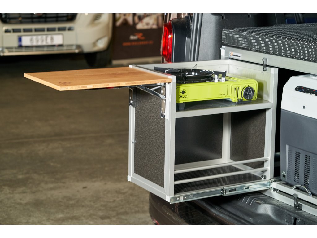 - Box s varičom obsahuje kartušový varič od firmy Meva, výklopnú drevenú bio dosku vhodnú na prípravu jedla a objemný úložný priestor pod varičom.