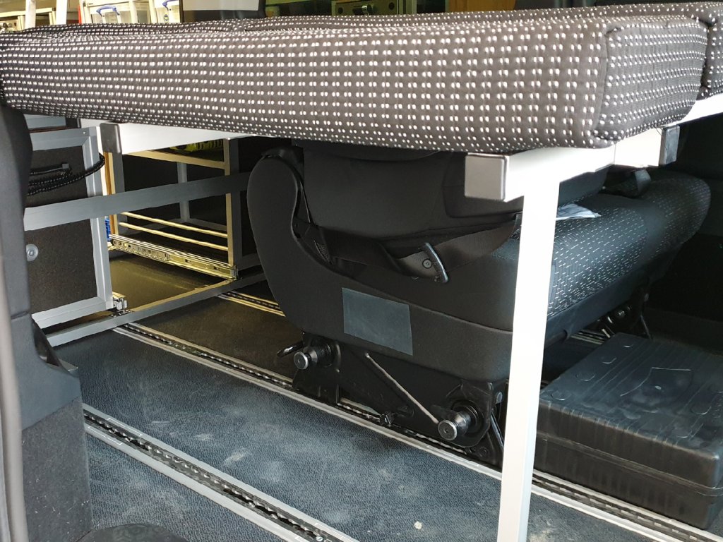 - Posteľ s dĺžkou 200cm s molitanovým matracom (výška matraca 7cm). Matrac je šitý na mieru a je cez celú šírku auta. Posteľ je nezávislá na sedadlách (video). Po rozložení postele Vám vznikne pod posteľou úložný priestor s výškou cca 58cm.