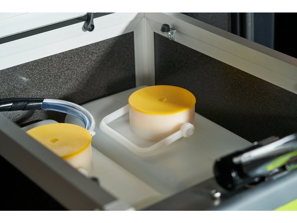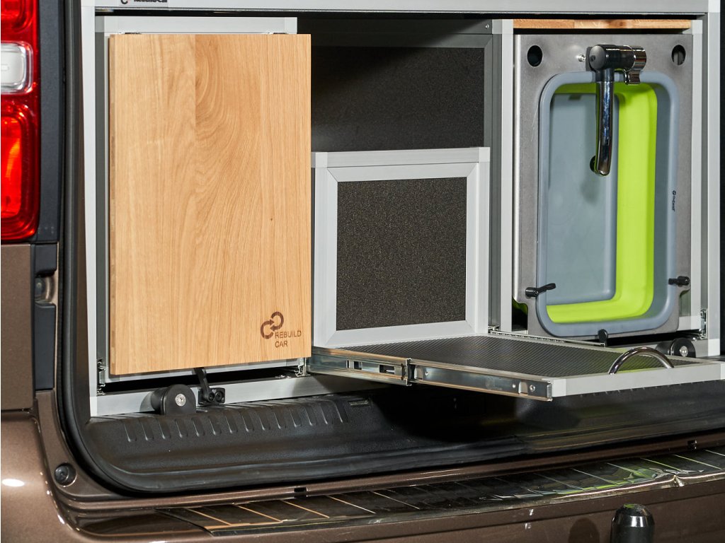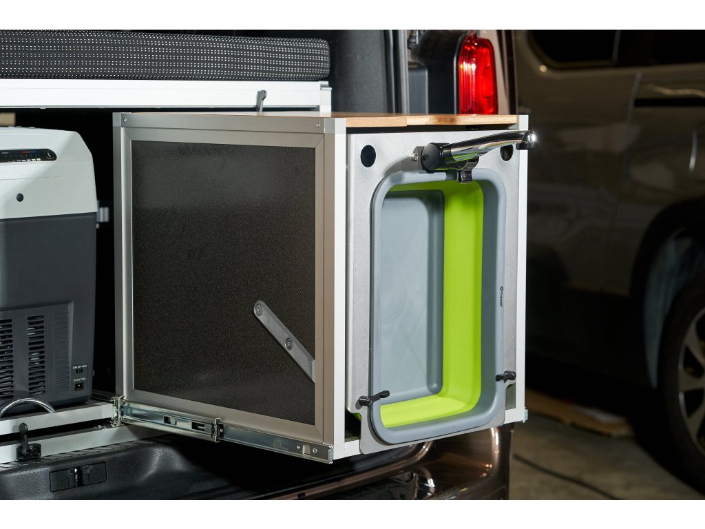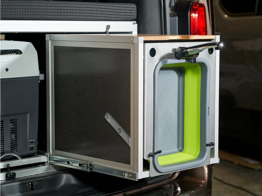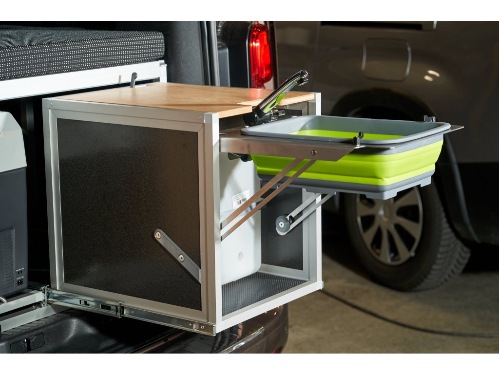 - Box s vodou je vybavený 2 kanistrami s objemom 2x 15 litrov a 12V čerpadlom. Hlavná časť výklopného drezu je z nerezových dielov, ktorý osadzujeme skladacím drezom od firmy Outwell. Box je z hornej časti zakrytý drevenou bio doskou vhodnou na prípravu jedla.