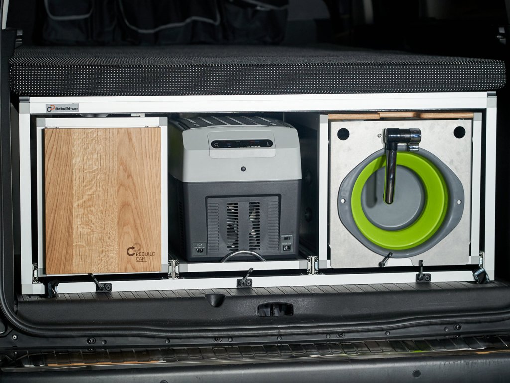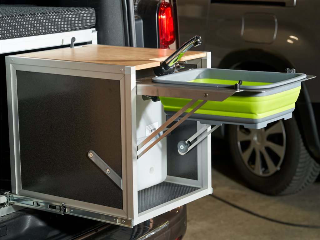 - Box s vodou je vybavený 2 kanistrami s objemom 2x 15 litrov a 12V čerpadlom. Hlavná časť výklopného drezu je z nerezových dielov, ktorý osadzujeme skladacím drezom od firmy Outwell. Box je z hornej časti zakrytý drevenou bio doskou vhodnou na prípravu jedla.