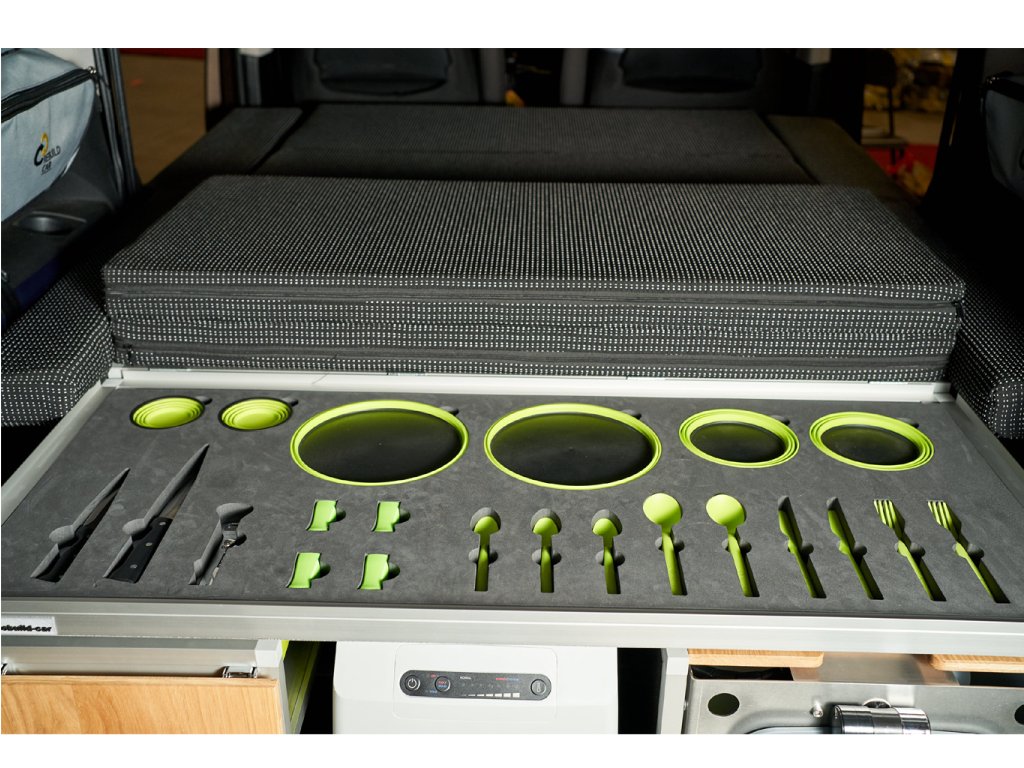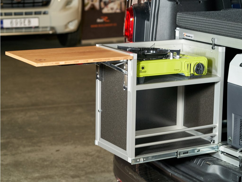 - Box s varičom obsahuje kartušový varič od firmy Meva, výklopnú drevenú bio dosku vhodnú na prípravu jedla a objemný úložný priestor pod varičom.